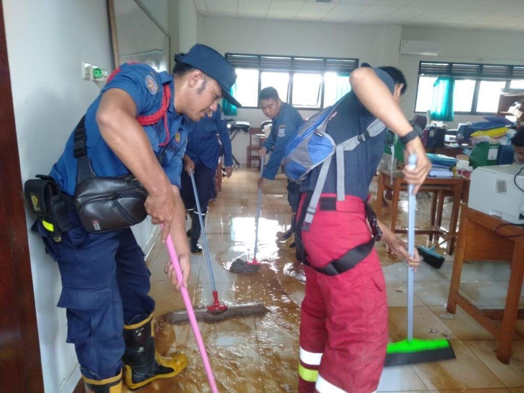 Dengan berkoordinasi dengan Dinas Damkar Tangsel, membersihkan lumpur bekas Banjir.
