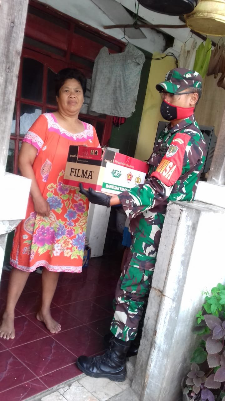 Pembagian paket Sembako di lakukan Sertu Yuli Hindi Babinsa Kelurahan Batusari Kecamatan Batuceper Kota Tangerang untuk warga yang terdampak virus Covid-19.