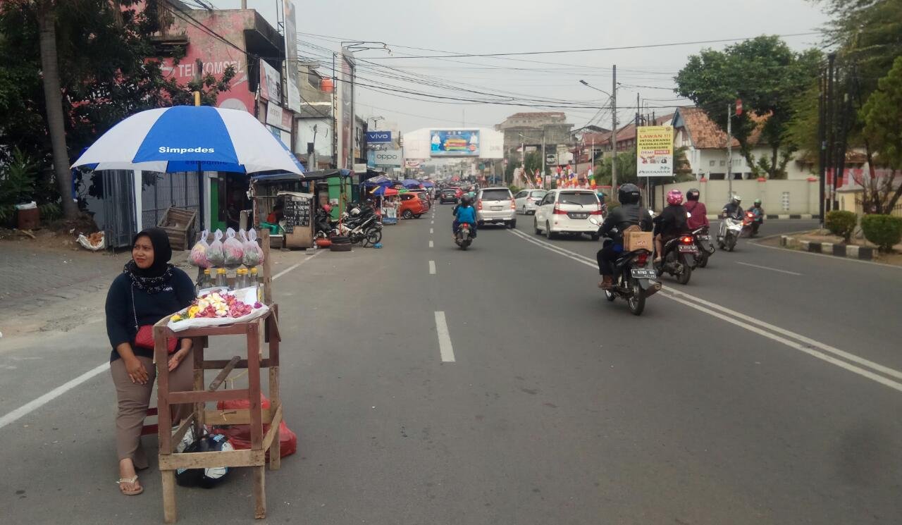 Biasanya, di pinggir jalan itu hanya terisi kendaraan – kendaraan parkir. Namun menjelang H – 2 lebaran Idul adha, berjajar pedagang bunga tabur dengan menggunakan meja dan payung seadanya.