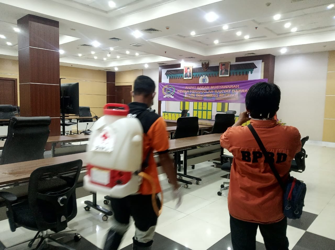 Sebelumnya, Petugas Badan Penanggulangan Bencana Daerah (BPBD) Kota Tangsel melakukan penyemprotan disinfektan di kantor DPRD Tangsel, Rabu (6/1/2021). Hal itu dilakukan setelah ditemukannya Ketua Fraksi Partai Solidaritas Indonesia (PSI) DPRD Kota Tangerang Selatan (Tangsel), Ferdiansyah yang terkonfirmasi positif Covid-19. (Ded)