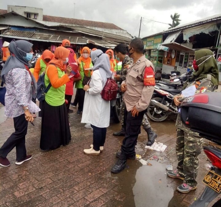 Muslimat PAC NU Kecamatan Pasarkemis, Kabupaten Tangerang bekerjasama dengan Pemerintah Kelurahan dan Babinsa mengadakan sosialisasi 4M di Pasar Elok, Pasar Kutabumi, serta membagikan 2400 masker dan hand sanitizer untuk para pedagang dan pembeli serta pengelola pasar, Senin (18/1/2021).