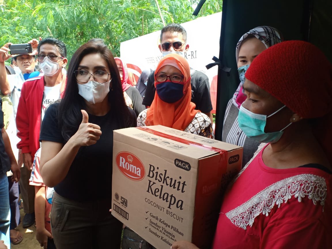 Anggota DPR RI Fraksi PDI Perjuangan Rieke Diah Pitaloka didampingi Ketua DPD PDI Perjuangan Jawa Barat, Ono Surono dan Ketua DPC PDI Perjuangan Kabupaten Bekasi, Soleman, berikan bantuan kepada warga yang terkena dampak Banjir, di Kampung Bojong Poncol RT02 RW04, Desa Sumbersari, Kecamatan Pebayuran, Kabupaten Bekasi, pada Jumat (12/2/2021)
