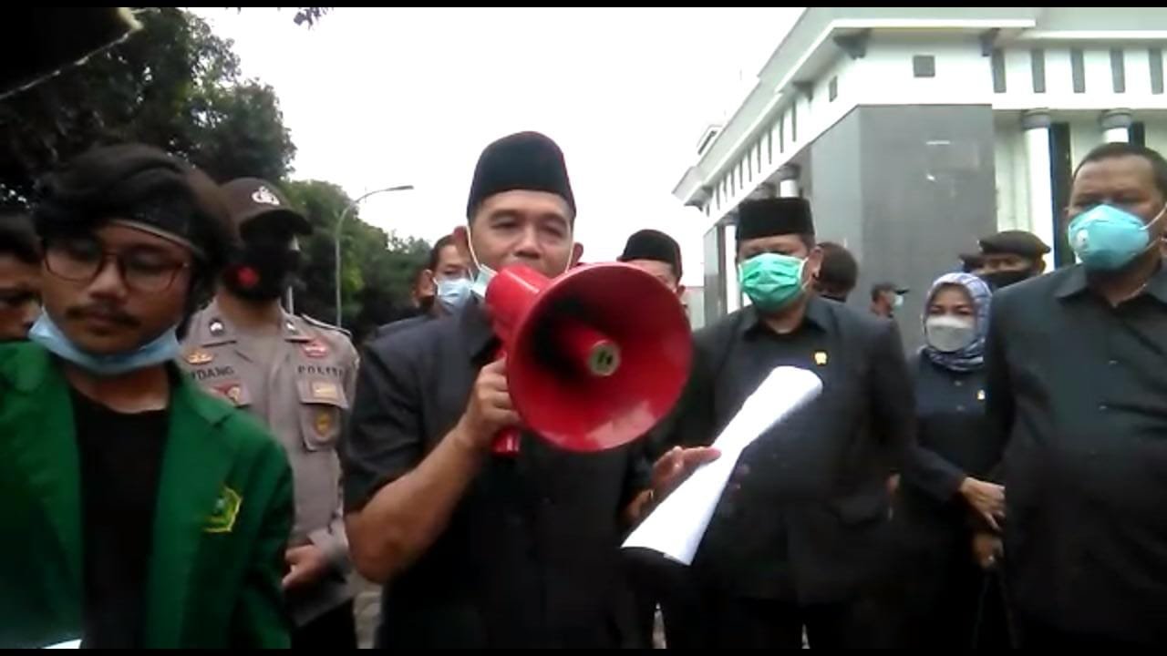 Tiga pimpinan DPRD Kabupaten Pandeglang sebelum melaksanakan rapat paripurna keluar untu menemui langsung sekolompok aksi mahasiswa Unma di gedung dewan dengan pengawalan dari Polres Pandeglang, Rabu (17/02/21) sekitar pukul 10.00 Wib.