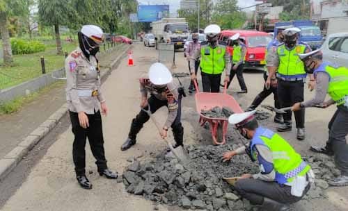 Rusaknya sejumlah ruas jalan yang ada di Bundaran Mandala, Kadu Agung, Kecamatan Cibadak, Kabupaten Lebak, Banten, membuat pihak Kepolisian dari Polres Lebak turun langsung bersama warga memperbaiki jalan.