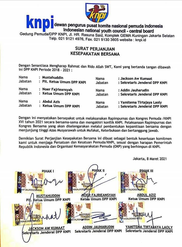 Hal itu diketahui dari beredarnya surat perjanjian kesepakatan bersama yang ditandatangani diatas materai oleh masing-masing Ketua Umum dan Sekretaris Jenderal DPP KNPI periode 2018-2021 tertanggal 8 Maret 2021.