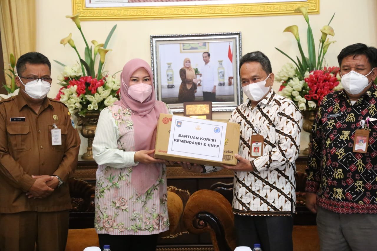 Korps Pegawai Republik Indonesia (Korpri) Kementerian Dalam Negeri (Kemendagri) salurkan bantuan sosial (Bansos) untuk Kabupaten Pandeglang. Bantuan tersebut berupa logistik, sembako dan obat-obatan langsung diterima oleh Bupati Irna Narulita di Pendopo, Selasa (23/03/21).