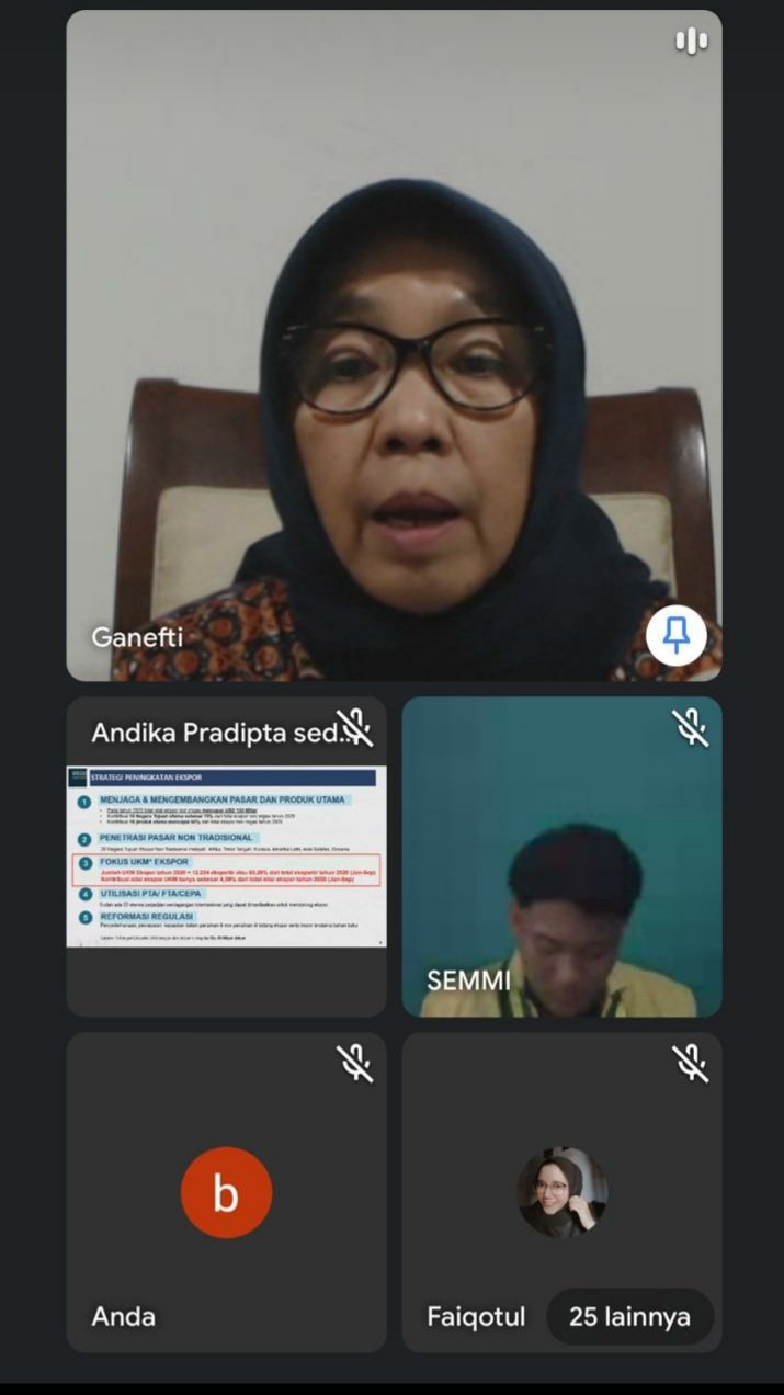 Menghadirkan narasumber dari pakar perekonomian, Sekretaris Dirjend Pengembangan Ekspor Nasional Kementrian Perdagangan RI Ganef Judawati.