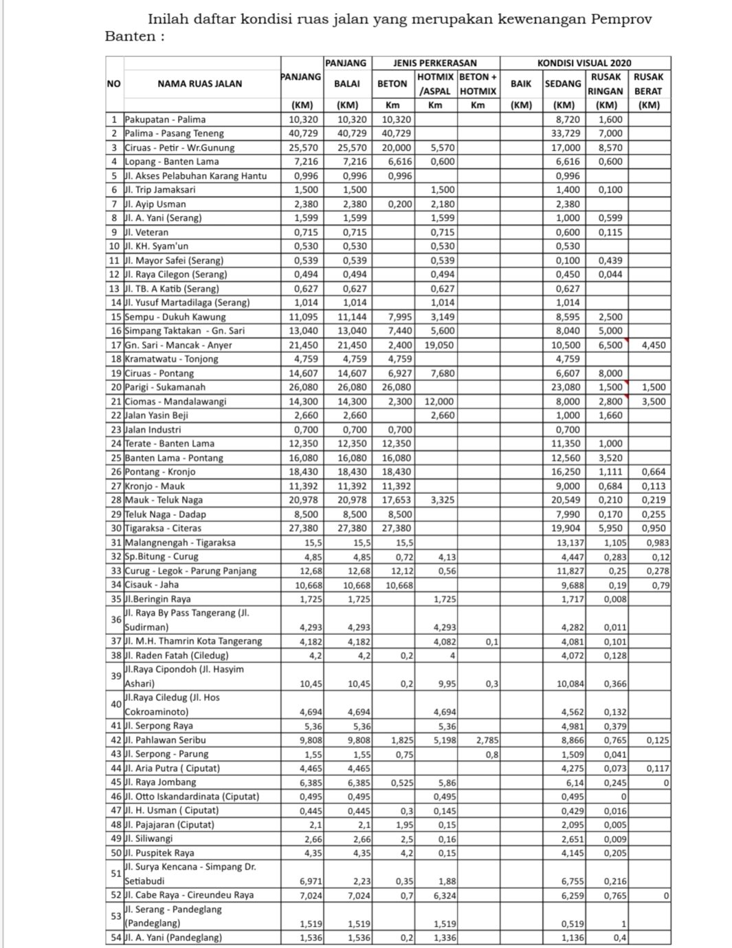 Pada akhir tahun 2020 pemerintahannya, Gubernur Banten H. Wahidin Halim dan Wakil Gubernur H. Andika Hazrumy nyaris merampungkan targetnya. Kondisi infrastruktur jalan yang merupakan  kewenanga Pemerintah Provinsi (Pemprov) Banten sebanyak 93,982% kondisinya mantap alias baik. Artinya, hanya menyisakan sebanyak 6,018%  yang berada dalam kondisi rusak.