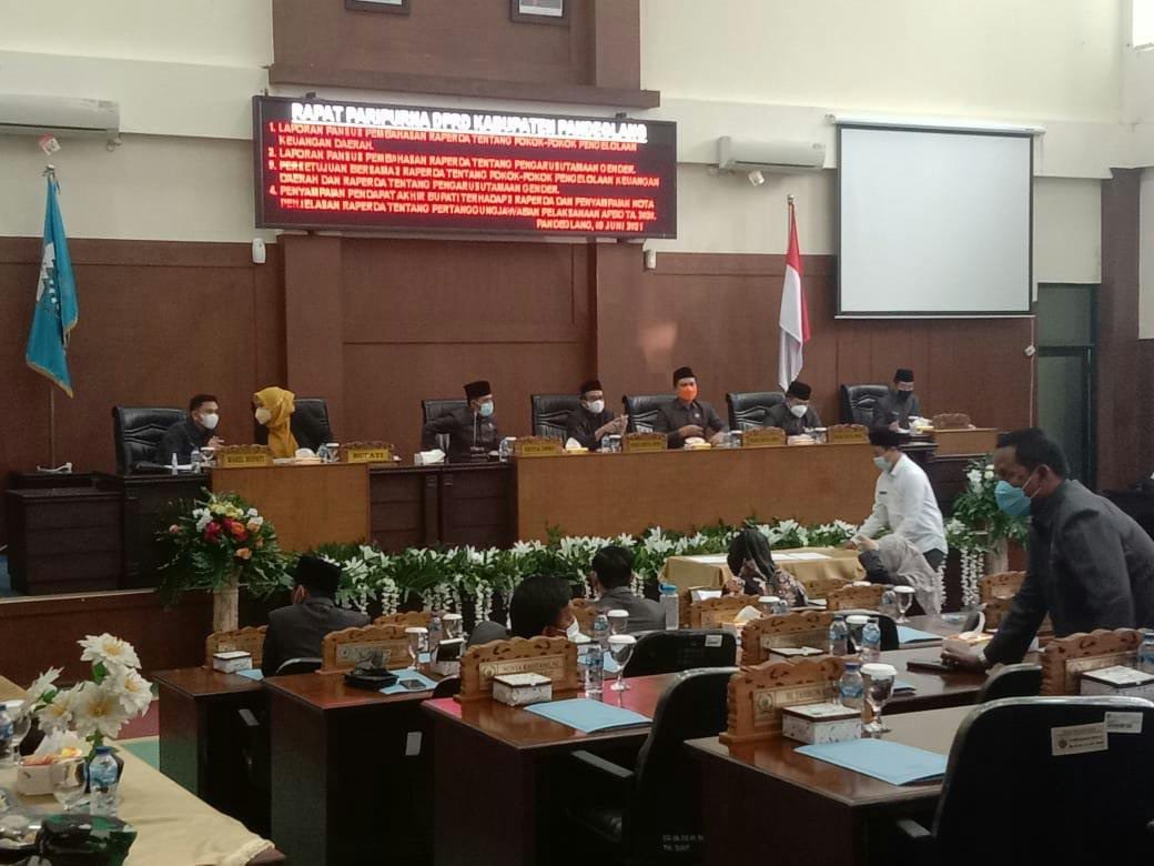 DPRD Kabupaten Pandeglang menggelar rapat paripurna tentang penyampaian hasil Panitia Khusus (Pansus) Pembahasan 2 Rancangan Peraturan Daerah (Raperda) tentang pokok-pokok pengelolaan keuangan daerah dan pengarusutamaan gender yang diusulan Pemkab Pandeglang diruang paripurna, Rabu (09/06/21).