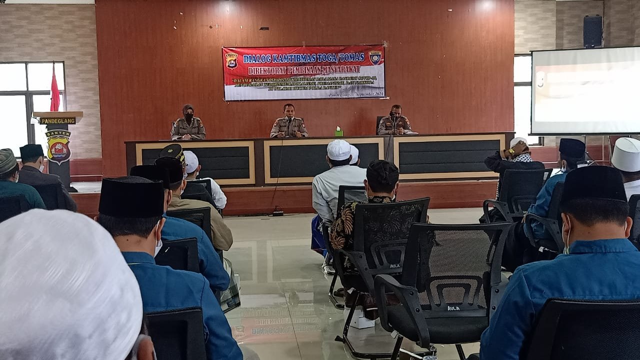 Kasat Binmas Polres Pandeglang IPTU Mulyana mengajak tokoh agama dan tokoh masyarakat se-Kabupaten Pandeglang untuk bersama-sama menjaga situasi Kamtibmas agar tetap kondusif di masa pandemi covid-19 serta pencegahan terorisme / radikalisme, premanisme dan narkoba di wilayah hukum Polres Pandeglang, Jumat (01/10/21). Dialog Kamtibmas berlangsung di Aula Polres Pandeglang