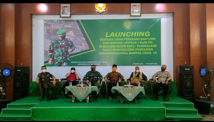 Komandan Distrik Militer (Kodim) 0601 Kabupaten Pandeglang, dipercaya menyalurkan Program Bantuan Tunai untuk Pedagang Kaki Lima dan Warung (BTPKLW) kepada 5.000 pedagang di seluruh wilayah Pandeglang.