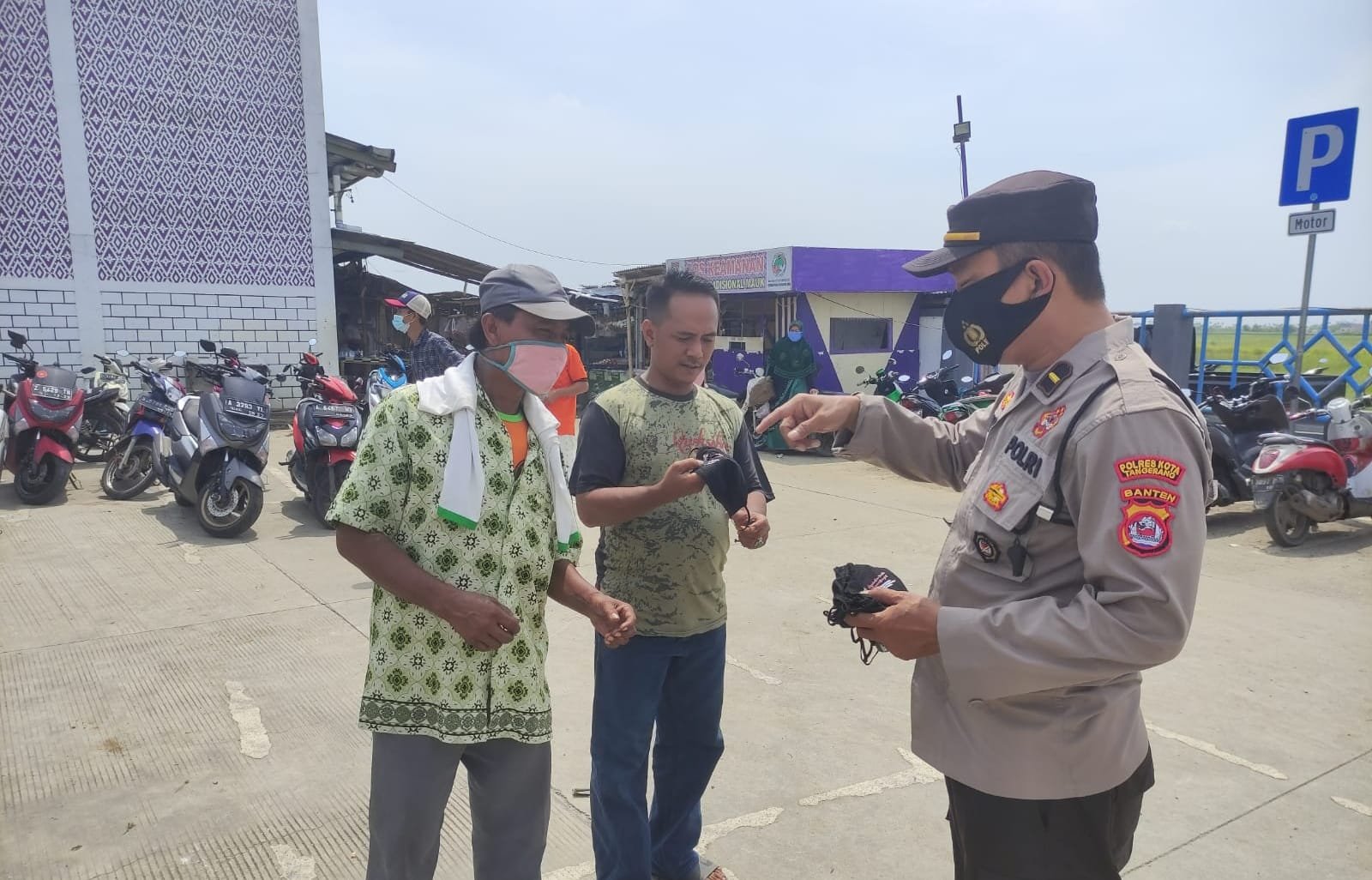 Kanit Patroli Polsek Mauk Polres Kota Tangerang Ipda Purwantoro giat disiplin Protokol Kesehatan (Prokes) sekaligus membagikan masker kepada masyarakat yang beraktivitas di Pasar Tradisional Mauk, Kelurahan Mauk Timur, Kecamatan Mauk, Kamis (21/10/2021).