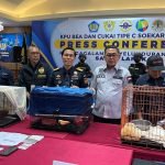 Kepala Kantor Pelayanan Utama Bea dan Cukai Tipe C Soekarno-Hatta Gatot Sugeng Wibowo didampingi Kepala Bidang Penindakan dan Penyidikan (P2) Zaky Firmansyah menunjukkan satwa liar yang akan diselundupkan ke India oleh RM (56) melalui Bandara Internasional Soekarno-Hatta. (tangerangonline.id).