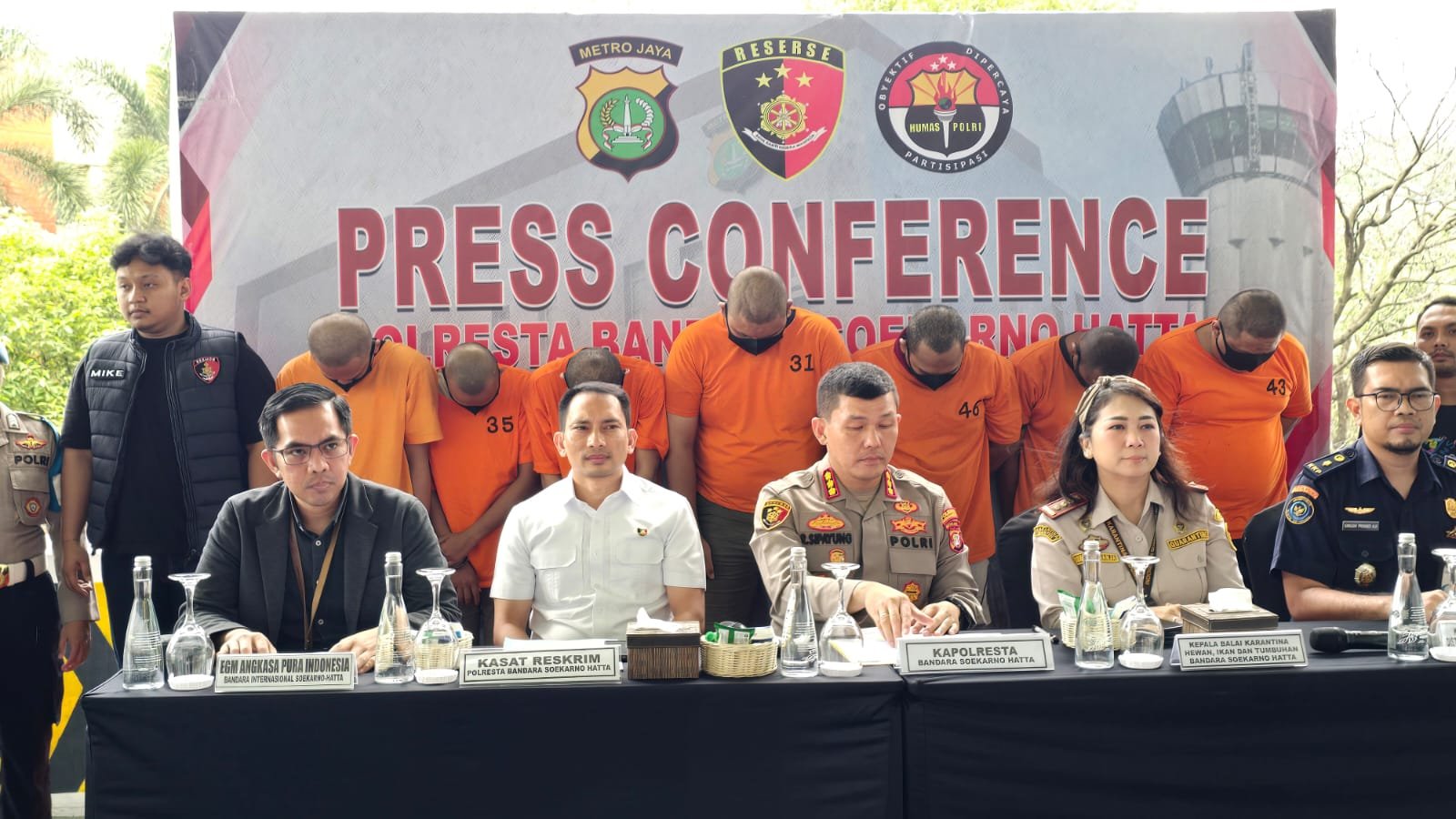 Polres Bandara Soekarno-Hatta mengamankan 7 tersangka penyelundupan Benih Bening Lobster. Dua diantaranya merupakan oknum Aviation Security (Avsec) pergudangan yang Terminal Kargo Bandara Soekarno-Hatta. (tangerangonline.id)