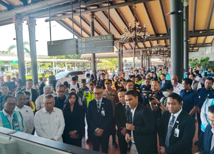 Menteri Perhubungan Republik Indonesia, Dudi Purwagandhi, melakukan pemantauan arus mudik Lebaran di Terminal 2 Bandara Soekarno-Hatta (Soetta), Tangerang, Senin (16/3/2026).