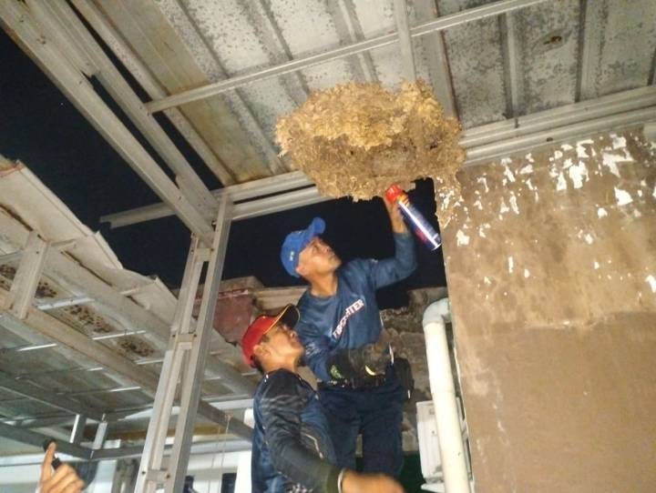 Proses evakuasi dilakukan pada malam hari guna meminimalkan risiko. Petugas menggunakan kapas untuk menutup lubang sarang serta cairan kimia khusus guna melumpuhkan koloni tawon sebelum sarang diturunkan.