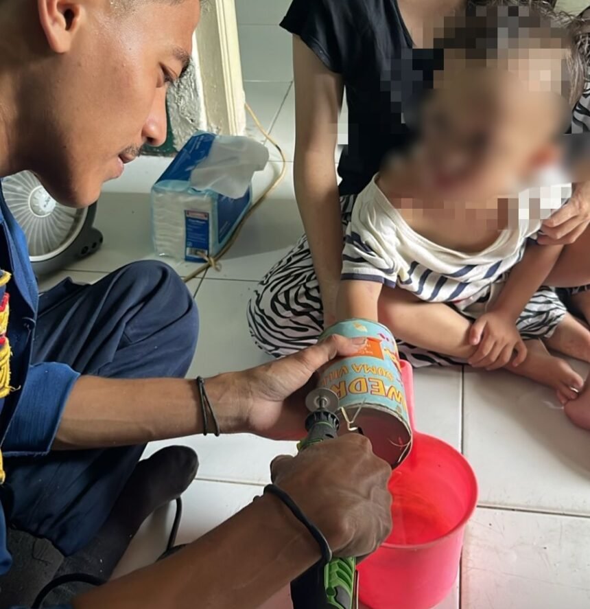 Di lokasi kejadian, kedua orang tua korban telah berupaya melepaskan tangan anaknya dengan bantuan sabun mandi. Namun, upaya tersebut tidak membuahkan hasil.