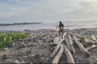 Kayu Gelondongan Penuhi Pesisir Pantai Teluk Labuan